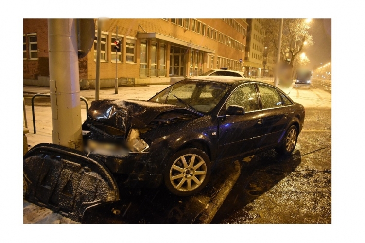 A fenti képen az egyik balesetben összetört autó látható. Egy gépkocsi ütközött neki egy oszlopnak 2021. december 5-én 3 óra 35 perc körül Budapest XIII. kerületében, a Váci út és a Victor Hugo utca kereszteződésében. Ebben a balesetben egy ember súlyosan megsérült.
