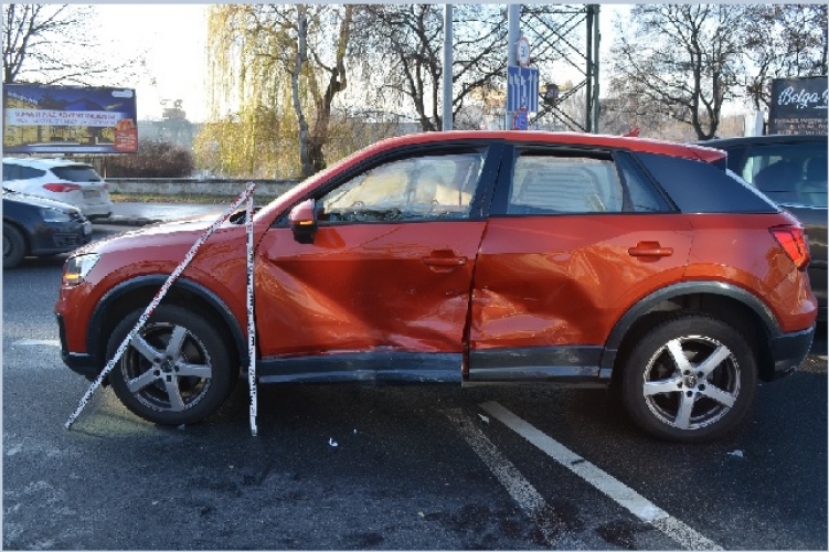 A fenti képen az egyik balesetben összetört személygépkocsi látható. Eddig tisztázatlan körülmények között ütközött össze két autó 2021. december 14-én 12 óra körül Budapest IV. kerületében, a Váci úton. Ebben a balesetben egy ember könnyebben megsérült.