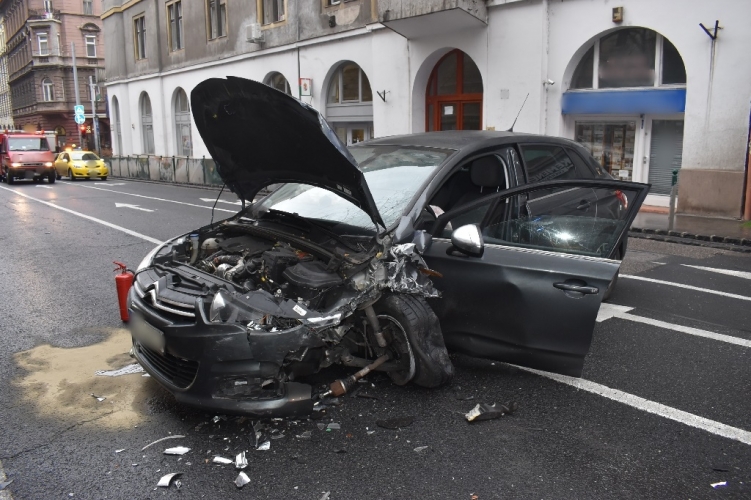 A fenti képen az egyik balesetben összetört egyik autó látható. Eddig tisztázatlan körülmények között 2021. december 28-án 10 óra 17 perc körül négy autó ütközött a Budapest, I. kerületi Attila úton. Ebben a balesetben egy ember könnyebben megsérült.