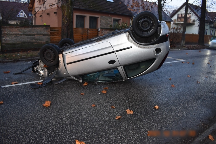 A fenti képen az egyik balesetben összetört személygépkocsi látható. Eddig tisztázatlan körülmények között fának ütközött és felborult egy autó 2021. december 31-én 6 óra 20 perc körül Budapest XXI. ker. Erdősor utcán. Ebben a balesetben egy ember könnyebben megsérült.