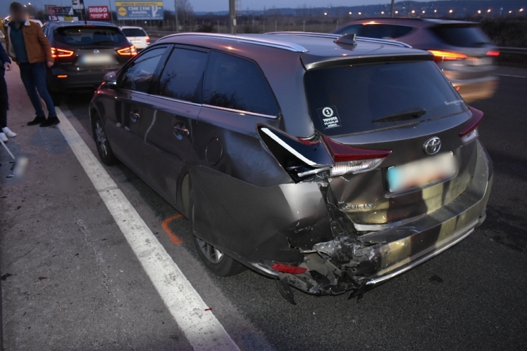 A fenti képen az egyik balesetben összetört autó látható. Négy autó ütközött össze 2022. január 8-án 15 óra 13 perckor Budaörs, M1-M7 bevezető szakaszon, a bal pálya 1205 méterszelvényében. Ebben a balesetben ketten sérültek meg könnyebben.