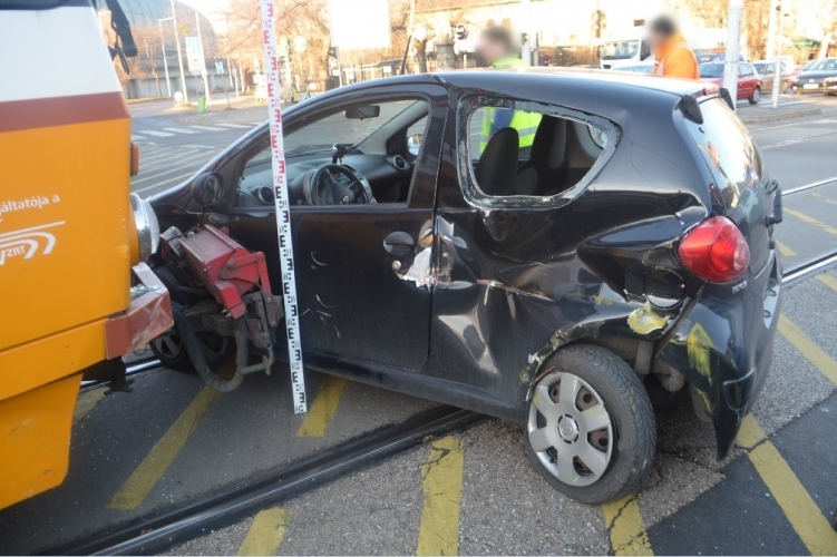 A fenti képen az egyik balesetben összetört személygépkocsi látható. Eddig tisztázatlan körülmények között ütközött össze egy autó és egy villamos 2022. január 21-én 7 óra 55 perc körül Budapest XIV. kerületében, a Hungária körúton. Ebben a balesetben egy ember könnyebben megsérült.