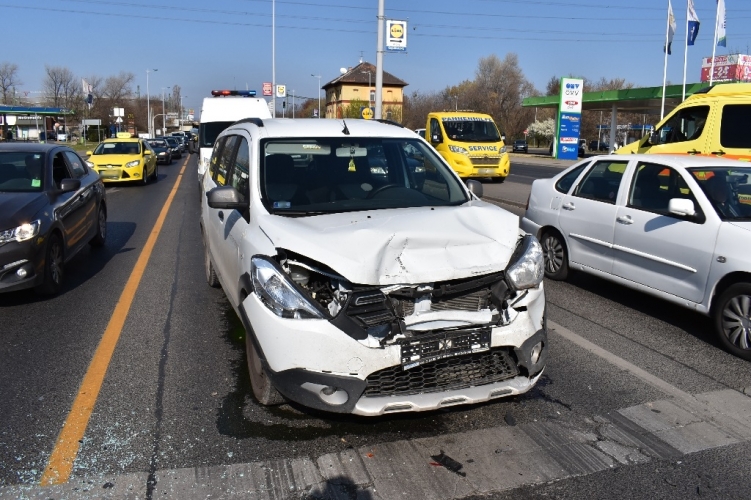 A fenti képen az egyik balesetben összetört autó látható. Két autó ütközött össze 2022. március 27-én 9 óra 41 perckor Budapest IX. kerületében, az Üllői út és az Ecseri út kereszteződésében. Ebben a balesetben egy ember sérült meg könnyebben.