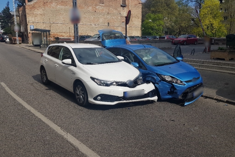 A fenti képen az egyik balesetben összetört két autó látható. Eddig tisztázatlan körülmények között 2022. április 16-án 9 óra 13 perc körül két személygépkocsi ütközött a Budapest, XII. kerületi Városmajor utcában. Ebben a balesetben nem sérült meg senki.