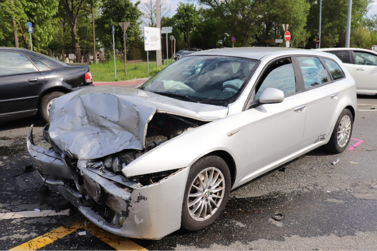 A fenti képen az egyik balesetben összetört autó látható. Két autó ütközött össze eddig tisztázatlan körülmények között 2022. május 1-jén 14 óra 50 perc körül Budapest XVI. kerületében, a Szabadföld úton. Ebben a balesetben egy ember könnyebben megsérült.