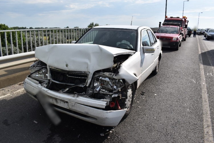 A fenti képen az egyik balesetben összetört autó látható. Három autó ütközött össze eddig tisztázatlan körülmények között 2022. június 10-én 16 óra 25 perc körül Budapest XXIII. kerületében, az M5-ös autópálya kivezető szakaszán. Ebben a balesetben két ember könnyebben megsérült.