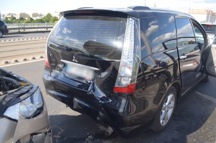 A fenti képen az egyik balesetben összetört autó látható. Három autó ütközött össze eddig tisztázatlan körülmények között 2022. július 12-én 14 óra 35 perckor Budapest IX. kerületében, a Petőfi hídon. Ebben a balesetben két ember könnyű sérülést szenvedett.