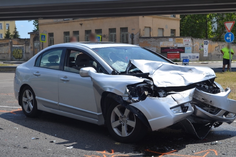 A fenti képen az egyik balesetben összetört autó látható. Két autó ütközött össze eddig tisztázatlan körülmények között 2022. július 16-án 12 óra 43 perckor Budapest X. kerületében, a Gyömrői úton. Ebben a balesetben egy ember könnyű sérülést szenvedett.