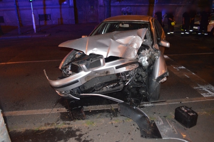 A fenti képen az egyik balesetben összetört autó látható. Egy autó ütközött villanyoszlopnak eddig tisztázatlan körülmények között 2022. július 24-én 2 óra 30 perckor Budapest VI. kerületében, a Bajcsy-Zsilinszky út és az Alkotmány utca kereszteződésében. Ebben a balesetben egy ember könnyű sérülést szenvedett.