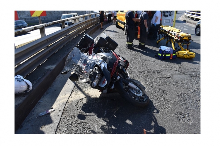 A fenti képen az egyik balesetben összetört motor látható. Egy gépkocsi és egy motor ütközött össze 2022. augusztus 5-én 15 óra 44 perc körül Budapest I. kerületében, az Erzsébet hídon. Ebben a balesetben egy ember súlyosan megsérült.