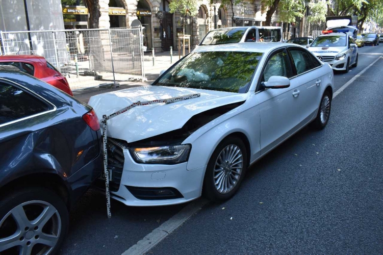 A fenti képen az egyik balesetben összetört autók láthatók. Három autó ütközött össze 2022. augusztus 6-án 9 óra 20 perc körül Budapest VI. kerületében, az Andrássy úton. Ebben a balesetben egy ember sérült meg súlyosan.