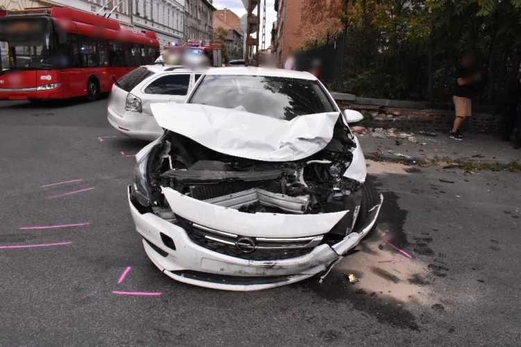 A fenti képen az egyik balesetben összetört autó látható. Két autó ütközött össze eddig tisztázatlan körülmények között 2022. augusztus 11-én 11 óra 10 perckor Budapest VII. kerületében, a Dohány utcában. Ebben a balesetben egy ember megsérült.