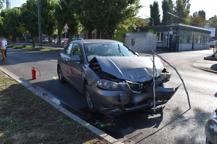 A fenti képen az egyik balesetben összetört autó látható. Három autó ütközött össze 2022. augusztus 25-én 7 óra 25 perckor Budapest IV. kerületében, a Berlini úton. Ebben a balesetben egy ember sérült meg könnyebben.