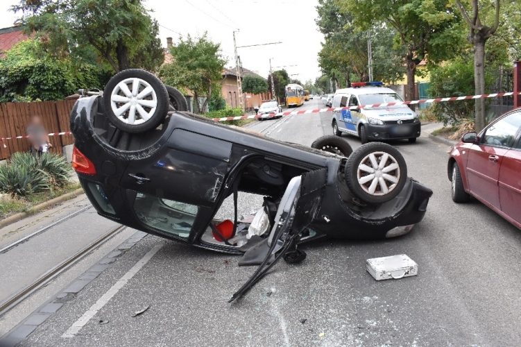 A fenti képen az egyik balesetben összetört egyik autó látható. Eddig tisztázatlan körülmények között 2022. szeptember 4-én 11 óra 38 perc körül egy autó egy parkoló kocsinak ütközött, majd felborult a Budapest, XX. kerületi Török Flóris utcában. Ebben a balesetben egy ember könnyebben megsérült.