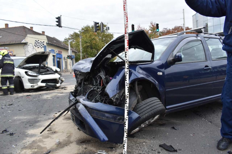 A fenti képen az egyik balesetben összetört autó látható. Eddig tisztázatlan körülmények között 2022. október 21-én 15 óra 15 perc körül két gépkocsi ütközött össze Budapest XIII. kerületében, a Röppentyű utcában. Ebben a balesetben két ember súlyos, másik két ember pedig könnyű sérülést szenvedett.