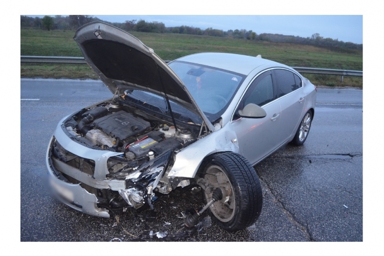 A fenti képen az egyik balesetben összetört autó látható. Két gépkocsi ütközött össze 2022. november 5-én 5 óra 35 perc körül Budapest XX. kerületében, a Szentlőrinci út és az M5-ös autópálya felhajtójának kereszteződésében. Ebben a balesetben egy ember könnyebben megsérült.