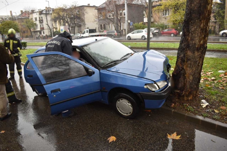 A fenti képen az egyik balesetben összetört autó látható. Eddig tisztázatlan körülmények között 2022. november 18-án 13 óra körül egy gépkocsi a járdaszegélyre hajtott, majd egy fának ütközött a XIV. kerületi Hungária körúton. Ebben a balesetben egy ember könnyebben megsérült.