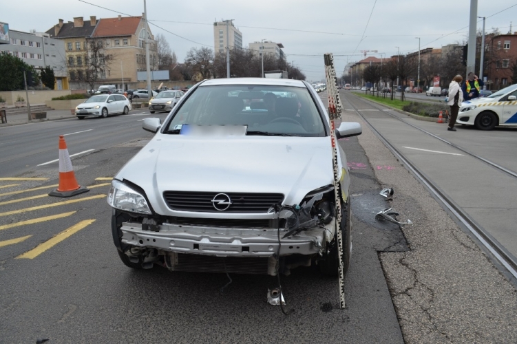 A fenti képen az egyik balesetben összetört autó látható. A jármű 2021. január 4-én 12 óra 20 perc körül Budapesten, a XIV. kerületi Hungária körútról a tilos jelzés ellenére balra kanyarodott, majd egy villamossal ütközött. Ebben a balesetben senki nem sérült meg.