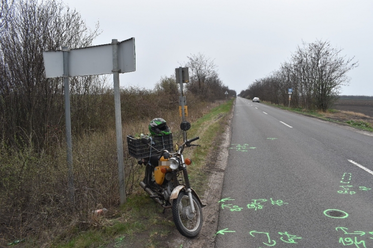 Egy újszászi lakos közlekedett személygépkocsival a 3122-es számú úton 2022. március 30-án 12 óra 40 perckor. Haladása során a gépkocsivezető nekiütközött a vele szemben közlekedő és balra kanyarodni szándékozó segédmotoros kerékpárnak. Az ütközéstől a motoros elesett, személyi sérülés nem történt.