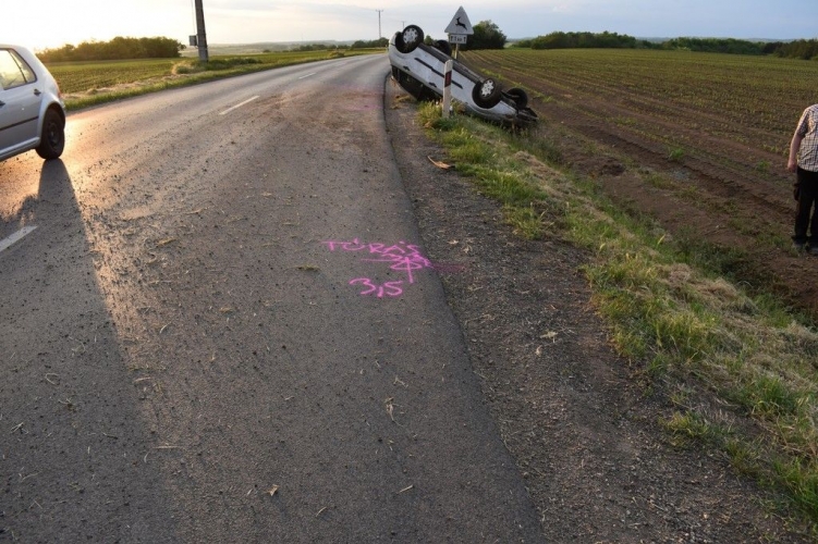 Egy 31 éves hőgyészi férfi közlekedett személygépkocsival Zomba irányából Kéty irányába. A 13-as kilométerszelvény közelében egy jobbra ívelő kanyarban elvesztette uralmát a jármű irányítása felett. Letért a jobb oldali útpadkára, onnan az árokba hajtott, majd az autó a tetejére borulva állt meg. Az autó utasa - egy 57 éves hőgyészi nő - könnyebben megsérült, őt a mentő kórházba szállította.