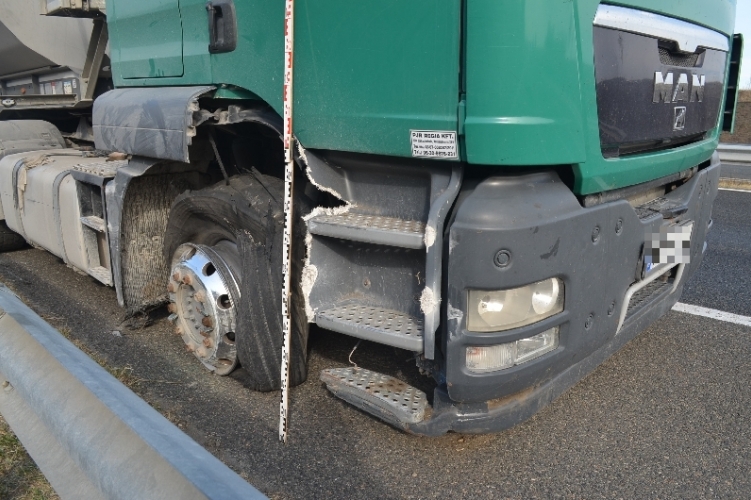 Délután 14 óra 23 perc körüli időben az M6-os autópálya Pécs felé vezető oldalán, a 97-es kilométerszelvényben történt egy anyagi káros baleset. Egy férfi közlekedett pótkocsis járműszerelvénnyel Pécs irányába, amikor a járművének jobb első kereke durrdefektet kapott, ennek következtében a szerelvény a jobb oldali szalagkorlátnak ütközött, majd a leállósávon állt meg.
