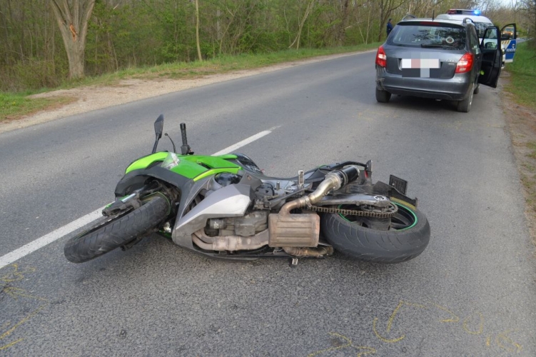 Ugyanazon a napon, Győrújbaráton közlekedett 17 óra 5 perckor egy Audi típusú személygépkocsi vezetője a Fő utca felől a Liszt Ferenc utca irányába. Haladása során a kereszteződéshez érve balra akart bekanyarodni, azonban a manővert nem kellő körültekintéssel és figyelemmel hajtotta végre, ezért összeütközött a vele szemben egyenesen közlekedő motorossal. A motoros azért, hogy az ütközést elkerülje jobbra kormányzott, azonban megcsúszott, uralmát elveszítette a járműve irányítása felett, elesett, majd szalagkorlátnak ütközött. A baleset következtében a motorkerékpár vezetője megsérült, őt a mentők kórházba vitték.