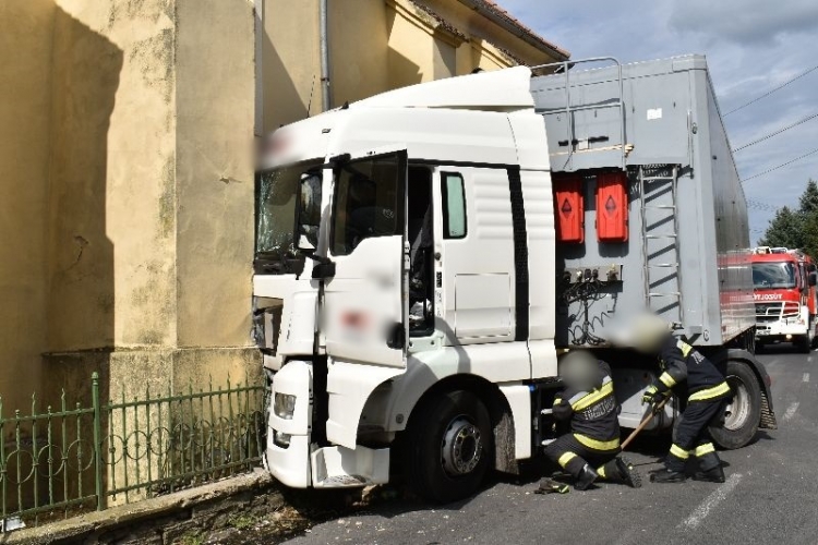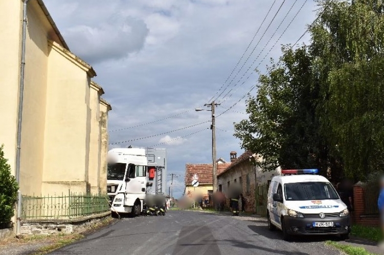 Egy 53 éves derecskei férfi közlekedett 2021. augusztus 26-án 15 óra 5 perckor Zalatárnok, Petőfi Sándor utcában Nova irányába egy nyerges vontatóból és a hozzá kapcsolt félpótkocsiból álló járműszerelvénnyel. Haladása során lehaladt a jobb oldali útpadkára, majd egy templom kerítésének, majd falának ütközött neki. A balesetben személyi sérülés nem történt.