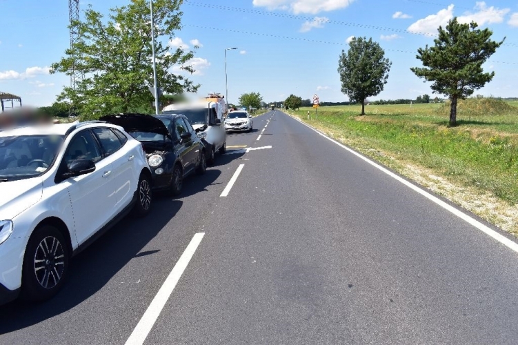 Egy 25 éves zalaegerszegi férfi közlekedett egy személygépjárművel 2022. augusztus 3-án délelőtt a 76-os számú főút Zalaegerszeget elkerülő szakaszán, Bagod felől. Az 56-os kilométerszelvénynél későn észlelte a vele azonos irányba közlekedő és forgalmi okok miatt lassító 26 éves szombathelyi nő által vezetett gépjárművet, és hátulról nekiütközött, majd utóbbi autót nekilökte az előtte haladónak, amit egy 39 éves zalaegerszegi férfi vezetett. A balesetben személyi sérülés nem történt.