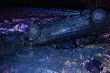 A gépkocsit vezető férfi a jeges úton megcsúszott és felborult járművével.