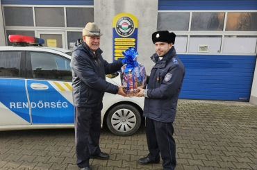 Békefi Árpád a Magyar Autóklub Nyugat-dunántúli Regionális Szervezetének képviselője adta át Boros Tamás rendőr zászlósnak és Soós Márton Péter rendőr őrmesternek a Magyar Autóklub hagyományos évbúcsúztató ajándékát.