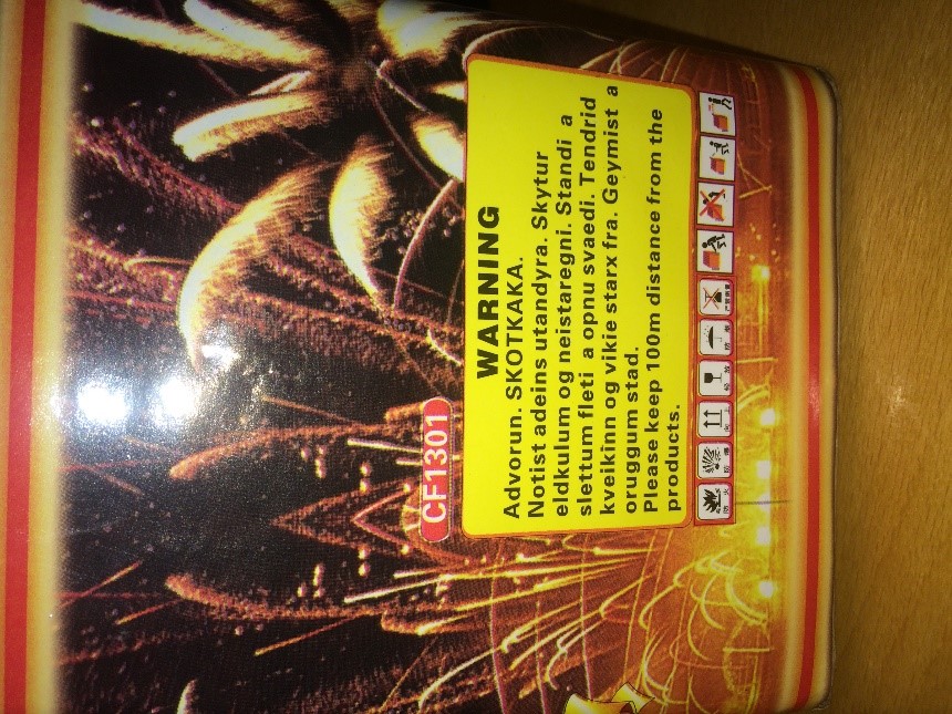 A termék nem felel meg a Pirotechnikai Irányelvben foglaltaknak és az Európai Szabványnak (EN15947)