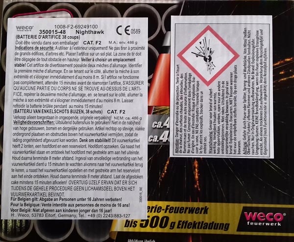 A termék nem felel meg a Pirotechnikai Irányelvben foglaltaknak és az Európai Szabványnak (EN15947) |