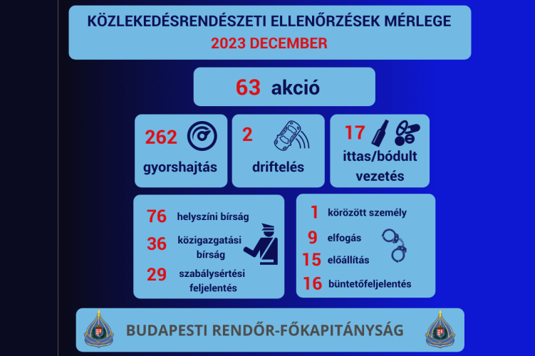A Budapesti Rendőr-főkapitányság munkatársai 2023 decemberében összesen 63 olyan közlekedésrendészeti ellenőrzést tartottak, melynek fő célja a gyorshajtás és a közúti versenyzés elleni fellépés volt. Az ellenőrzésekhez nemcsak rendőrségi jelzéssel ellátott szolgálati gépkocsikat, hanem civil jellegű járműveket és kamerás drónokat is igénybe vettek, a méréseket pedig statikusan, illetve mozgó járművekből is végezték a rendőrök.