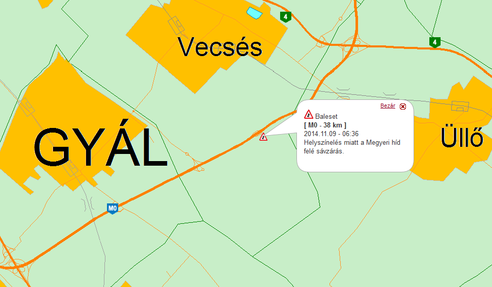Eddig tisztázatlan körülmények között ütközött össze egy személygépkocsi és egy tehergépkocsi az M0 autóút 38. kilométerszelvényében 2014. november 9-én 6 óra 30 perc körüli időben, a Megyeri híd felé vezető oldalon. A balesetben egy személy megsérült.