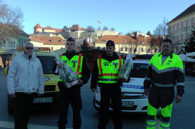 Koltai Úr egy jelképes ajándékkal kívánt Balesetmentes Új Évet a Magyar Autóklub tagsága nevében Tiszlavicz Gábor rendőr főtörzsőrmesternek és Pekk Szabolcs rendőr törzsőrmesternek, valamint a megyénk útjain közlekedőknek.