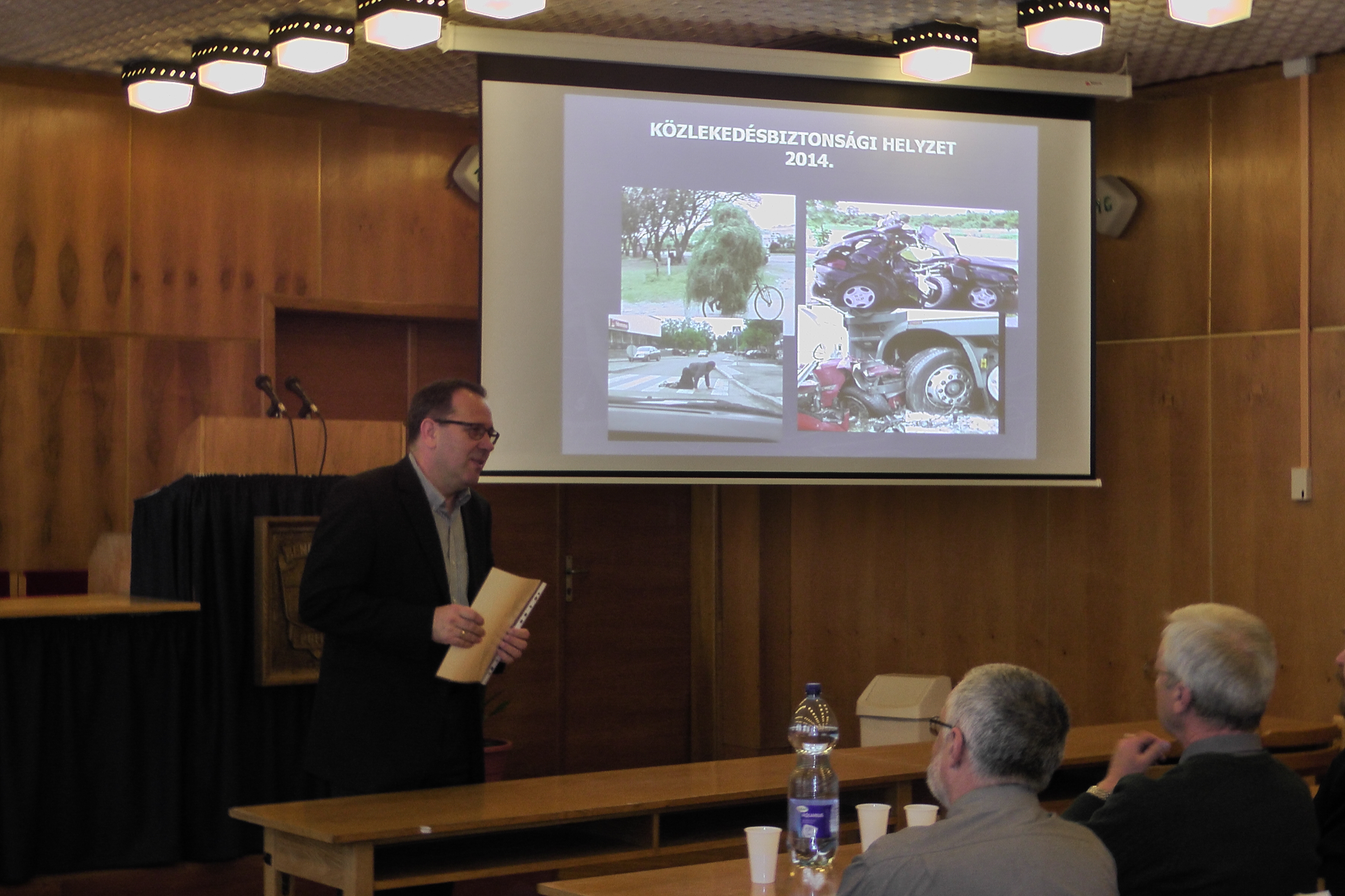 Meggyesfalvi Tamás r. alezredes, a Heves Megyei Rendőr-főkapitányság Közlekedésrendészeti Osztály vezetője és Erdélyi Róbert r. alezredes, a Heves Megyei Rendőr-főkapitányság kiemelt megelőzési főelőadója a 2014-es év baleseti és közlekedés biztonsági helyzetéről tartott előadást.