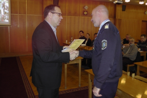 Szerencsi Gábor, a szervezet elnöke ezüst jelvény kitüntetést adott át Erdélyi Róbert r. alezredesnek a közlekedés biztonság, baleset megelőzés területén végzett kiemelkedő munkájáért.