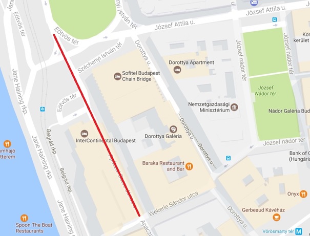 Apáczai Csere János utca páros számozású oldalán az Eötvös tér és a Wekerle Sándor utca között (Hotel Intercontinental bejáratánál).