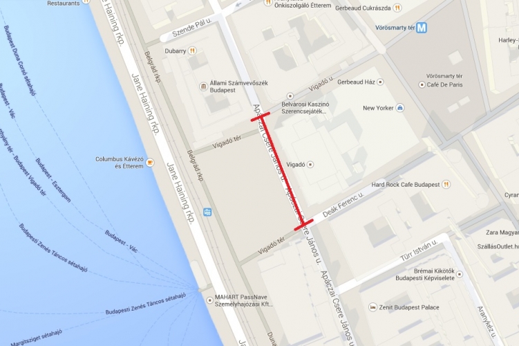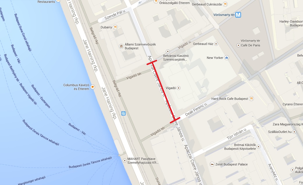Apáczai Csere János utca mindkét oldalán a Vigadó utca és a Deák Ferenc utca között.