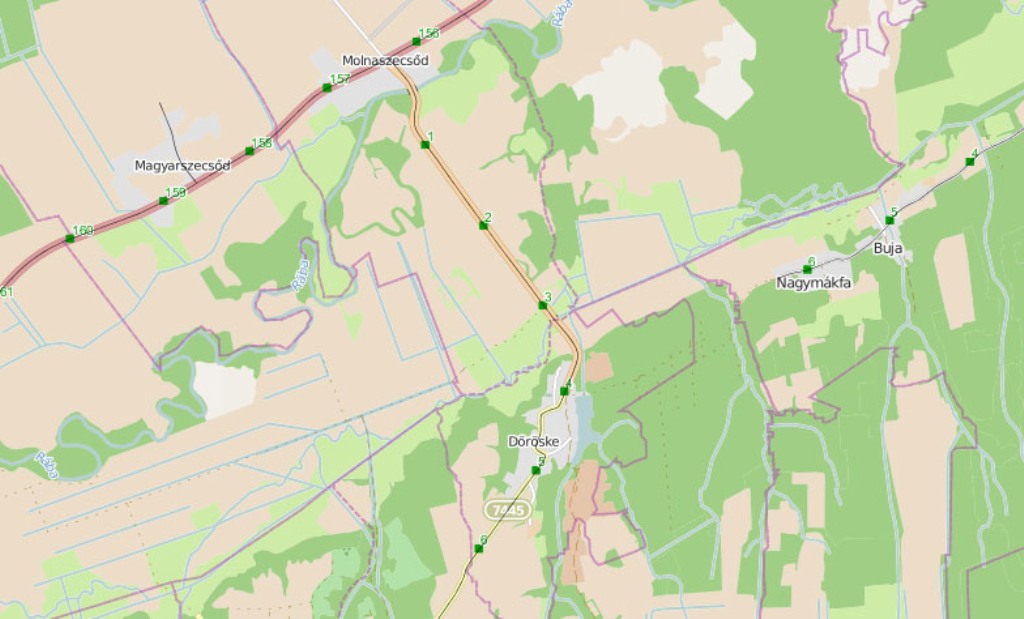 - a 7445-ös számú út 0+265 – 3+620 kilométerszelvény közötti szakaszán, Molnaszecsőd és Katafa között.