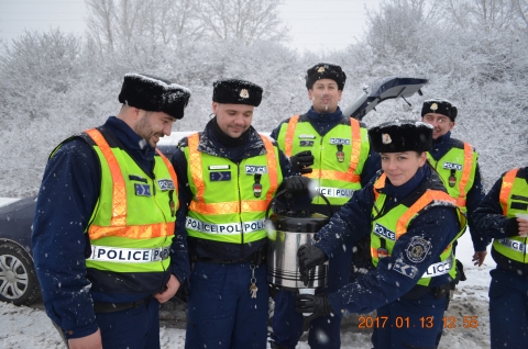 A szolgálatban lévő állomány a részükre biztosított védőitalból az utakon és a parkolókban leállított járművezetőknek is meleg teát ad.