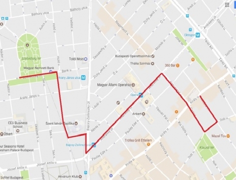 Szabadság tér – Bank utca – Hercegprímás utca – Szent István tér – Bajcsy-Zsilinszky út – Andrássy út – Nagymező utca – Dob utca – Akácfa utca útvonal.