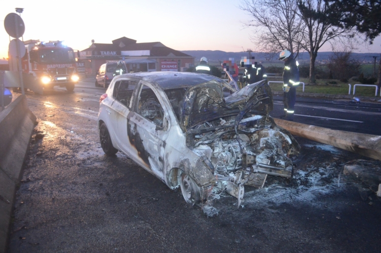 A járművezető először egy jelzőtáblának, majd egy kandelábernek hajtott, aminek következtében az autója kigyulladt.
