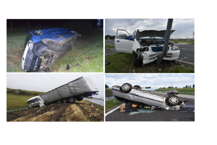 Járművek az árokban, villanyoszlopnak ütközve, fejük tetején