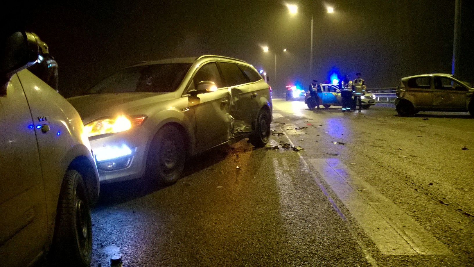 Jelenlegi adataink szerint 13 személygépkocsi ütközött össze 2016. december 23-án 21 óra körüli időben az M5 autópálya fővárosból kivezető szakaszán, az autópiacnál lévő felüljárón. Elsődleges adatok szerint a balesetben ketten sérültek meg könnyebben.