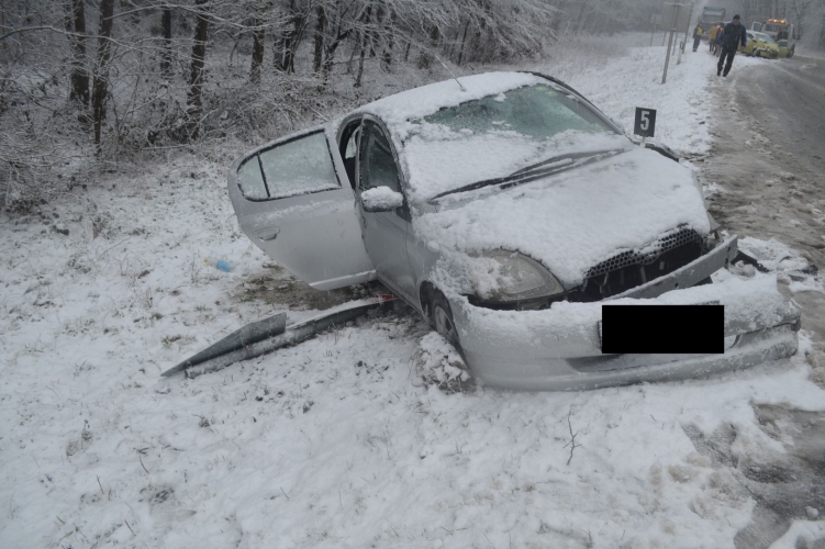 Az egyik gépjármű valószínűleg megcsúszott a havas, jeges úton.