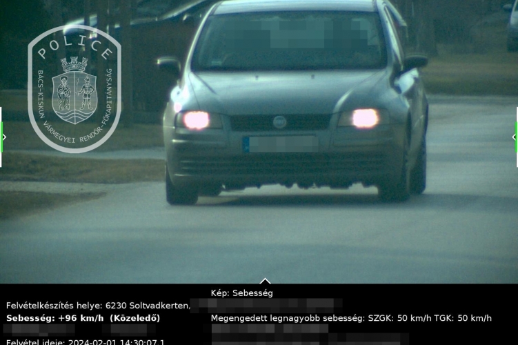 Az elmúlt héten a megengedett sebességhatárokat regisztráltan 1544-en lépték át. A jogsértések elkövetőinek legalább 39.000 forint közigazgatási bírságot kell fizetniük, de volt olyan autós, aki Soltvadkert belterületén a megengedett 50 km/h helyett 96 km/h-val közlekedett – ennek a sofőrnek már magasabb összegű bírságra kell számítania.