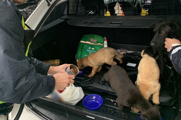 A kutyakölyök hangos nyüszítésbe kezdett, ekkor vették észre a rendőrök, hogy az út melletti füves területen további két kiskutya is van, illetve az anyakutya, aki mellső lábára sántított. A rendőrök az esőben teljesen elázott, remegő és átfázott kutyákat betették a rendőrautóba, hogy felmelegedjenek.