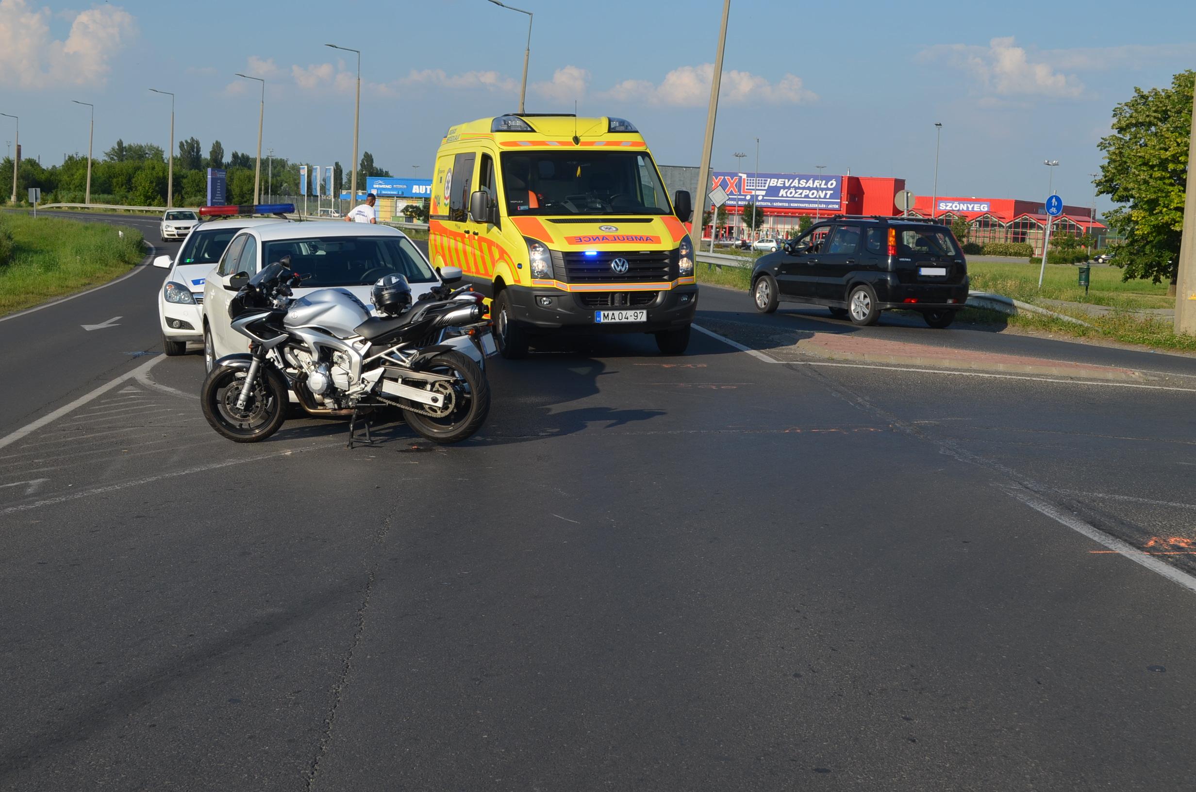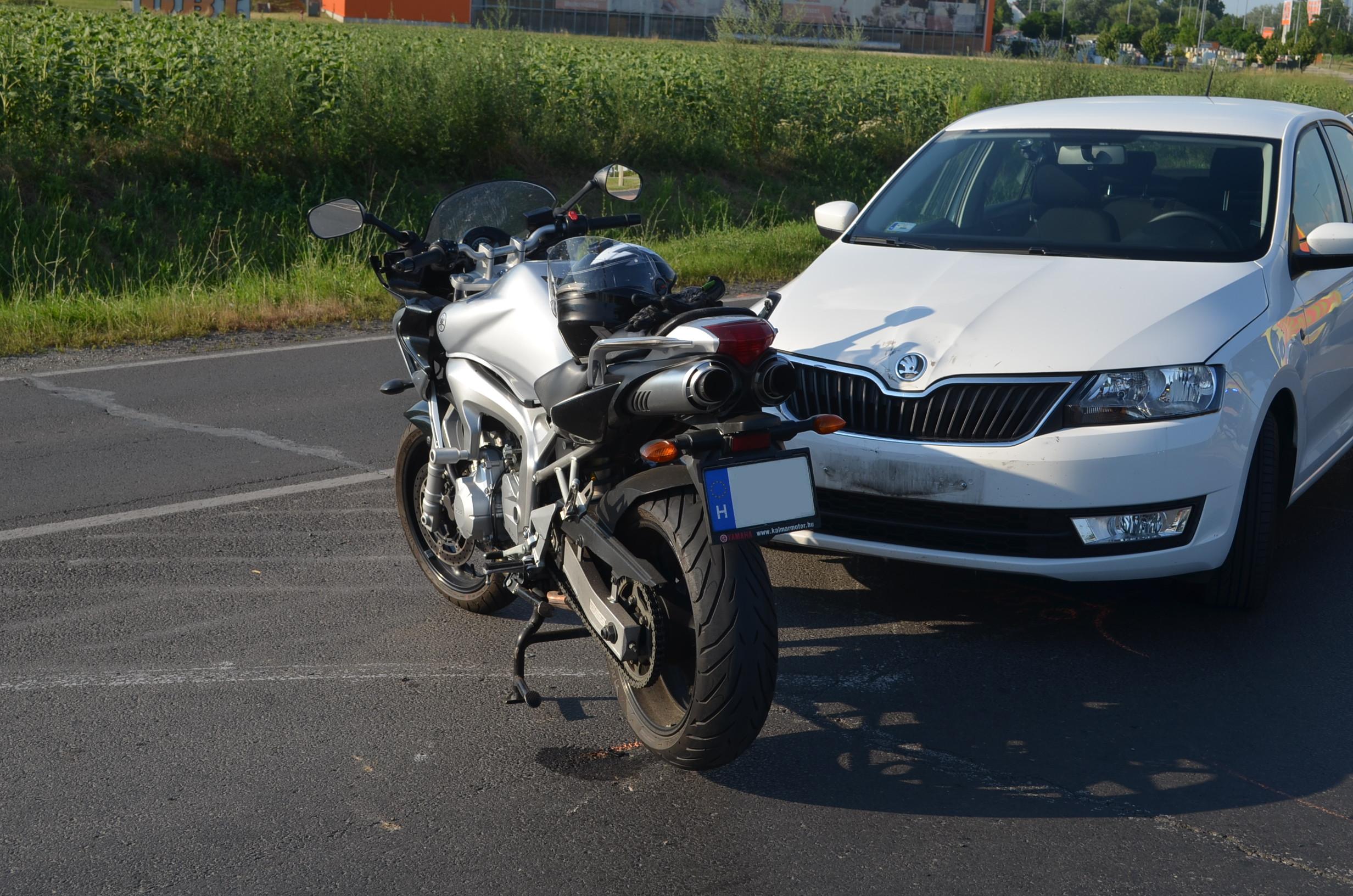 Motorkerékpár és személygépkocsi ütközött össze, a motoros megsérült.