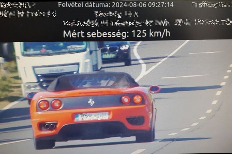 A nógrádi közlekedési járőrök augusztus 6-án a 2-es főúton figyeltek föl egy Ferrari Modena Spiderre, amely már önmagában vonzza a tekintetet, főleg akkor, ha a sebességmérő felvételének tanúsága alapján a megengedett 90 km/h helyett 125 km/h-val haladt. Munkatársaink a közel 400 lóerős, tűzpiros paripa vezetőjének a szabályszegés miatt 65 ezer forint közigazgatási bírságot és négy közúti közlekedési előéleti pontot szabtak ki, bízva abban, hogy a prevenciós jellegű büntetéssel további jogsértéseket előztek meg.